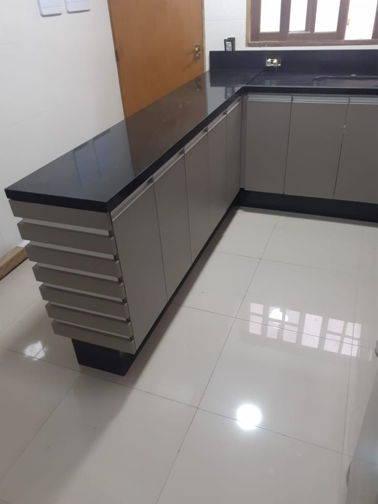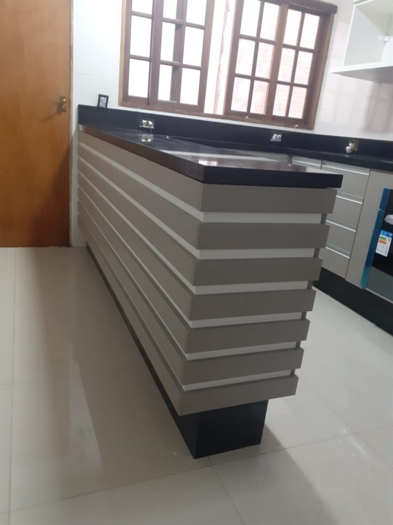 Cozinha integrada com.lavanderia com bancada e divisor de ambiente…