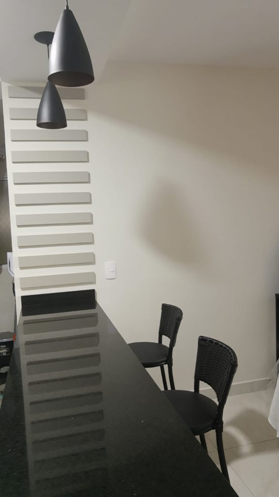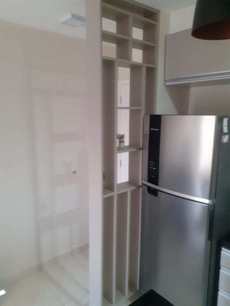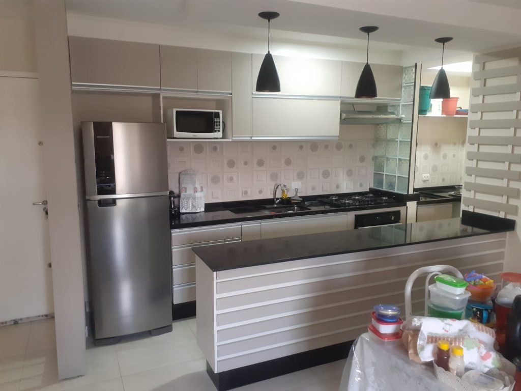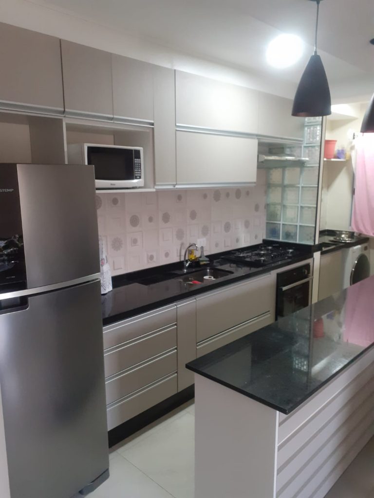 Cozinha integrada com.lavanderia com bancada e divisor de ambiente cor portas frape deixando o ambiente bem suave no granito são Gabriel combinando bem com a cor frape.